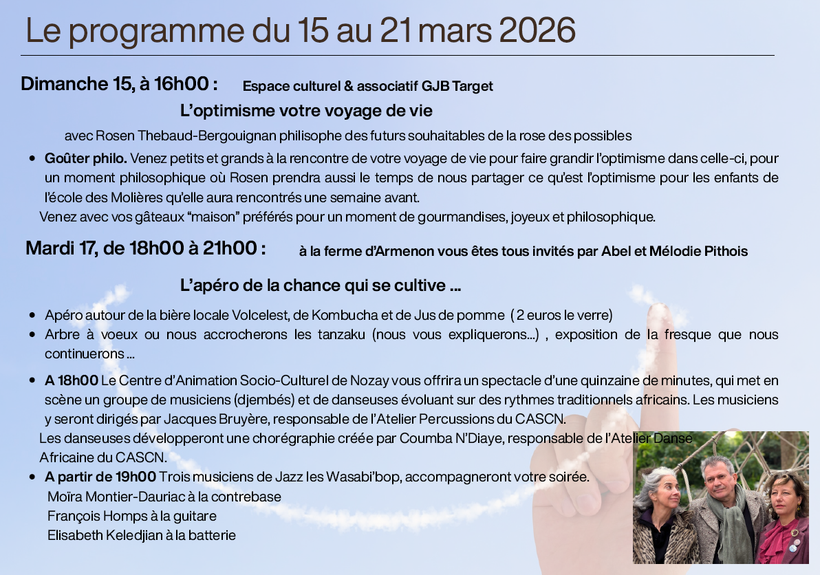Portée par un collectif de citoyennes et de citoyens joyeux, engagés et profondément optimistes, cette initiative est une invitation à ralentir, à se retrouver et à cultiver ce qui nous relie. L’optimisme que nous souhaitons faire vivre n’est ni naïf ni abstrait : il est concret, chaleureux et profondément humain. Il se niche dans un mot échangé sur la place du village, un sourire offert, une histoire racontée, un café partagé.