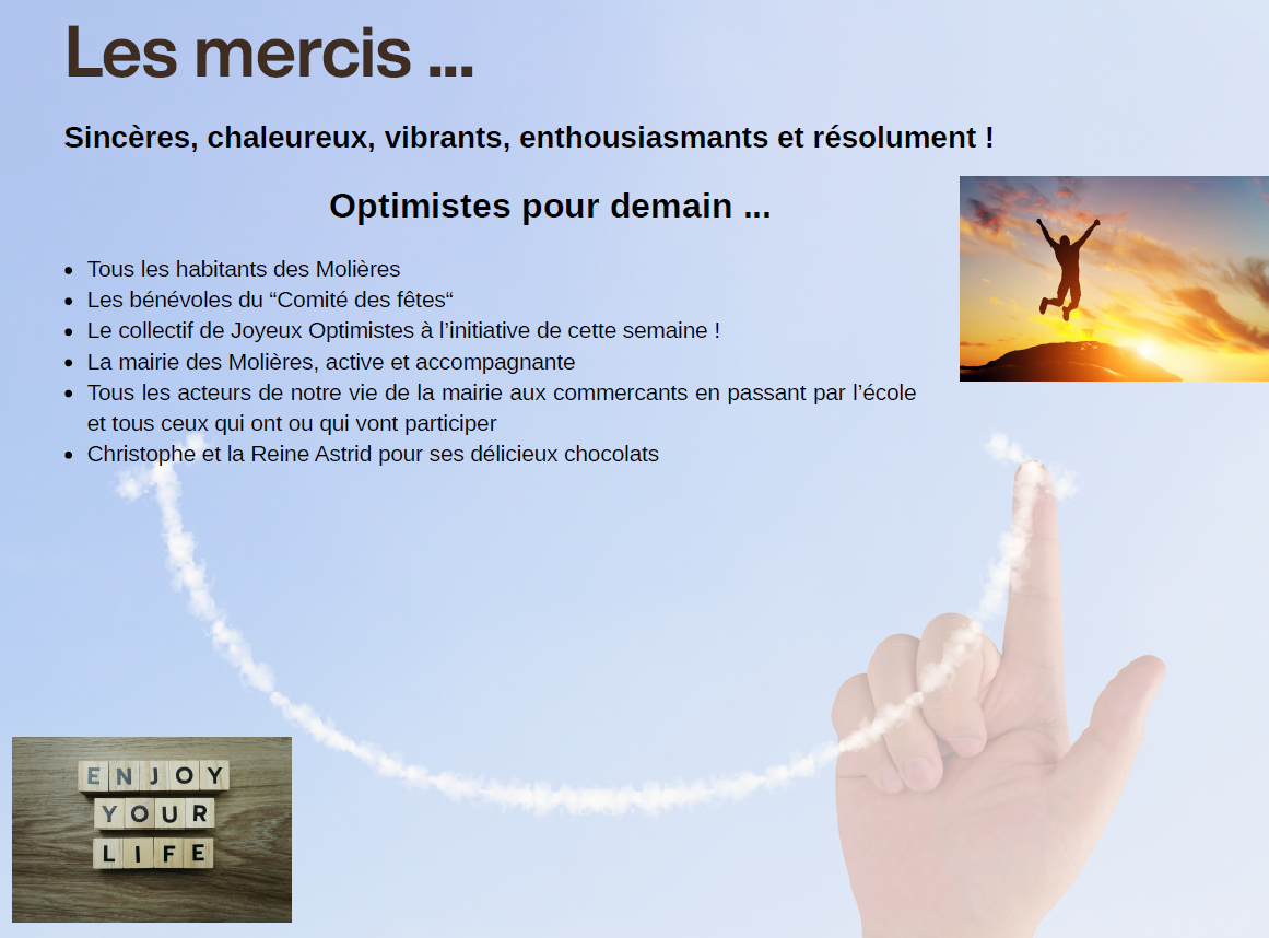 Aux Molières, village à taille humaine, l’optimisme trouve naturellement sa place dans la proximité, les rencontres et le plaisir simple d’être ensemble. Ici, on se croise, on se parle, on partage. Et c’est de cette vie de village, faite de liens quotidiens et de solidarités discrètes, qu’est née la Semaine de l’Optimisme.