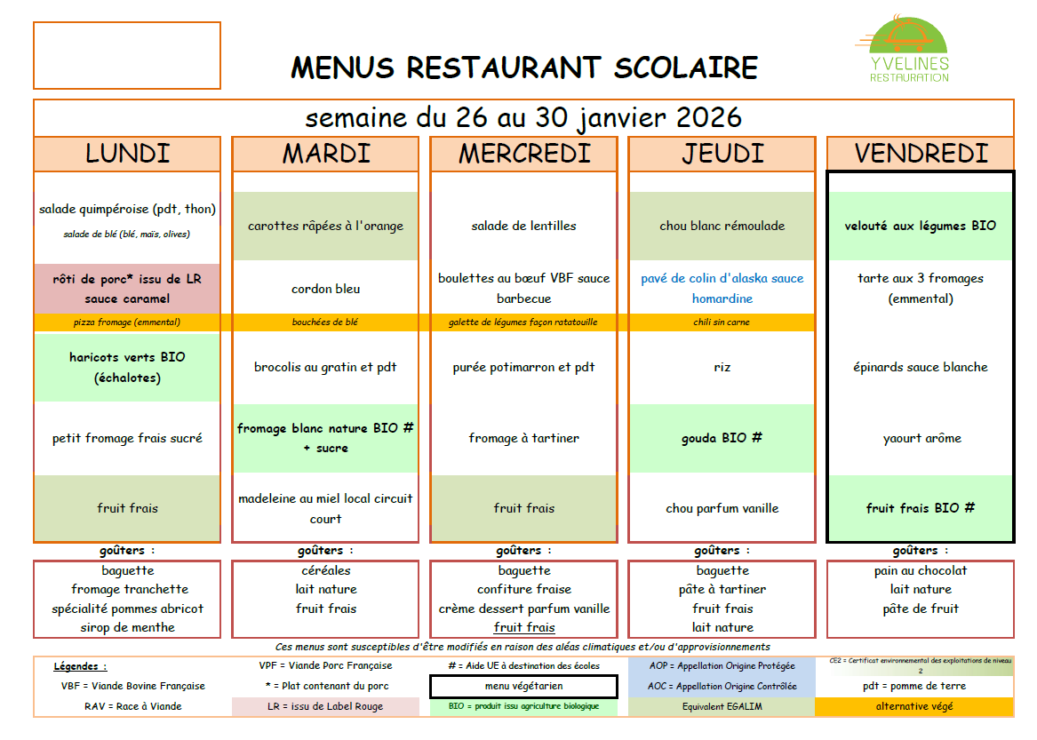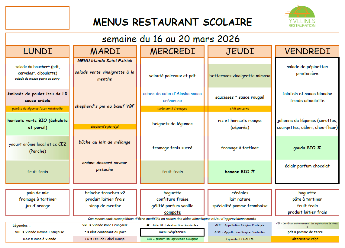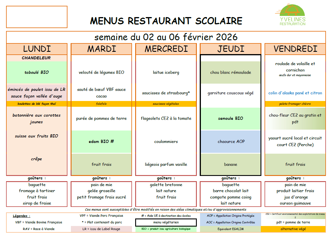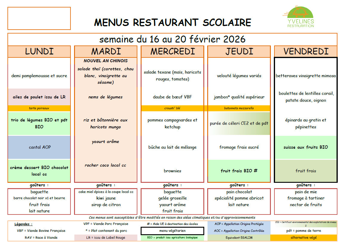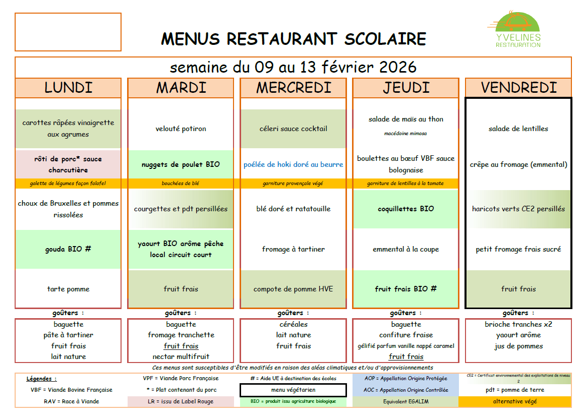 Vous trouverez ci-après les menus proposés par notre prestataire, Yvelines Restauration.