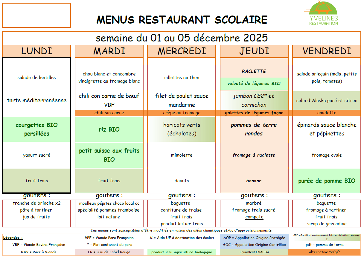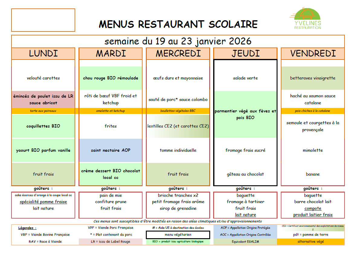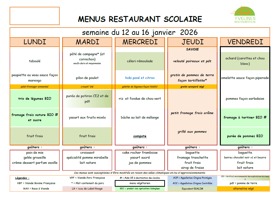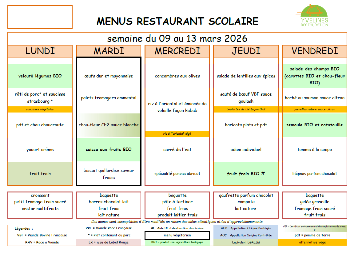 Vous trouverez ci-après les menus proposés par notre prestataire, Yvelines Restauration.