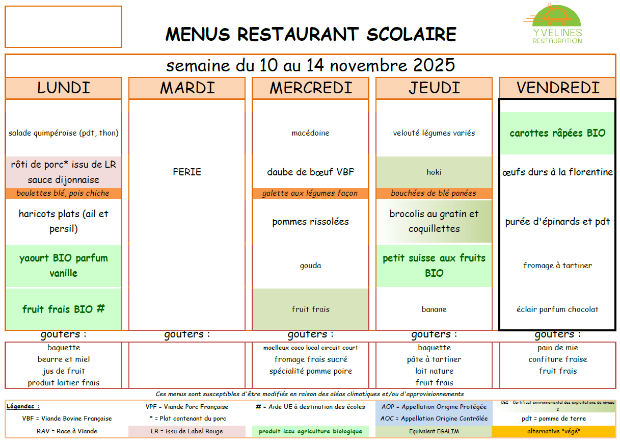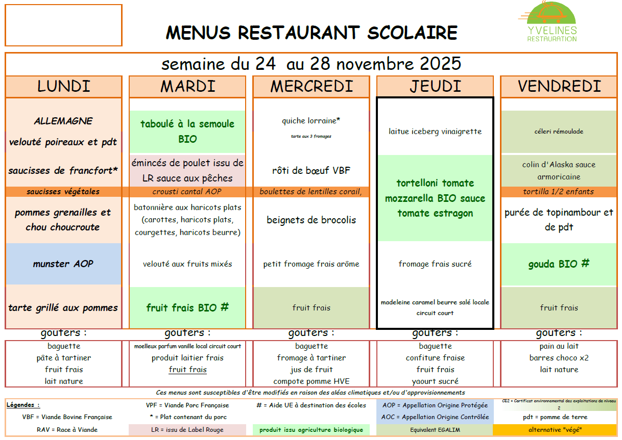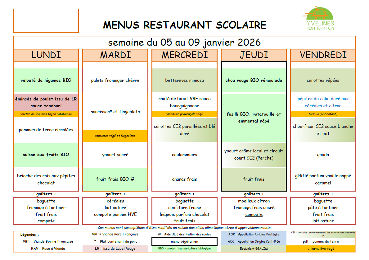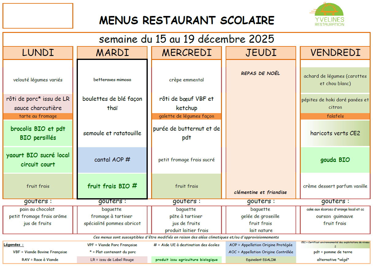 Vous trouverez ci-après les menus proposés par notre prestataire, Yvelines Restauration.